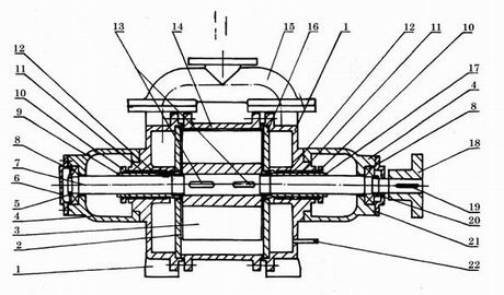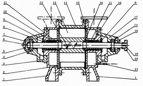 1.端蓋 2.后吸排氣園盤(pán) 3.葉輪 4.軸承架 5.園螺母 6.后軸承壓蓋 7.軸 8.軸承 9. 后軸套10.填料壓圈 11.填料 12.填料壓圈 13.平鍵 14.泵體 15.連通管 16.前吸排氣園盤(pán) 17.前軸套 18.聯(lián)軸器具 19.平鍵 20.園螺母 21.前軸承壓蓋