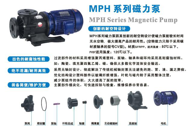 MPH磁力驅(qū)動循環(huán)泵運轉(zhuǎn)是在連軸上和葉輪上分別裝配有磁性材料而互相偶合,無需配以傳統(tǒng)機械軸封,因而是完全密封的。 |
