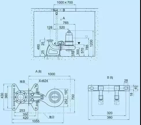 潛水泵耦合式安裝時,平面的開孔需考慮潛水泵的最小安裝尺寸。案例中A向視圖表示了水泵的最小安裝孔的大小尺寸,1000×700mm。